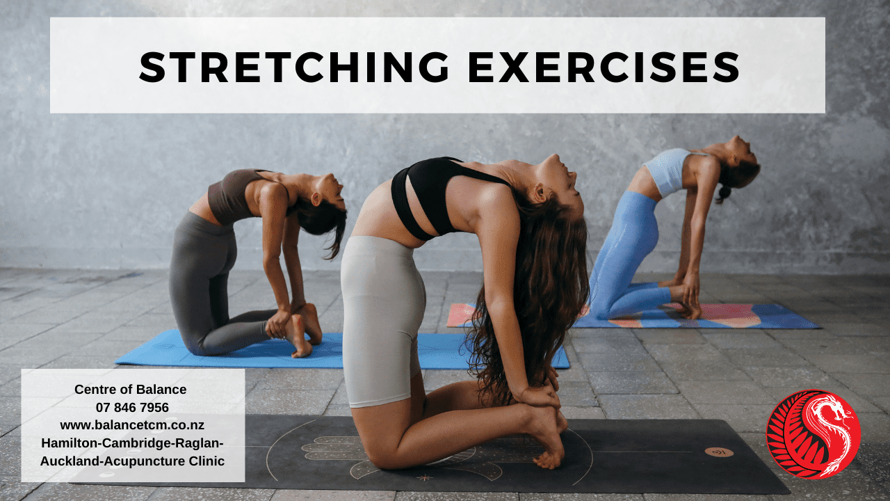 This video shows stretching exercises for different muscles. If you have any health issues that require attention, Centre of Balance is open from Tuesday to Saturday. We have clinics in Hamilton and Auckland and we can do online consultations for international patients. Call 07 846 7956 to book an appointment or email us at info@balancetcm.co.nz.